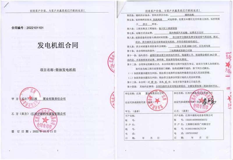 熱(rè)烈祝賀我公司與江西(xī)臨川一(yī)置業有限公司簽訂兩台濰柴柴油發電機組,該公司通(tōng)過我公司網站聯絡了(le)我公司有關工(gōng)作(zuò)人(rén)員(yuán)進行(xíng)了(le)咨詢,經過溝通(tōng)了(le)解了(le)有關産品信息和(hé)我公司簽訂供貨合同。